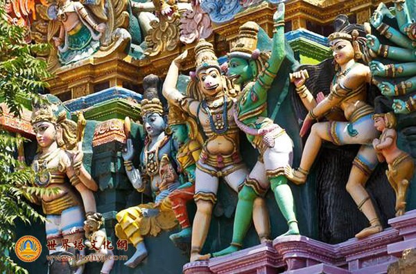 塔门呈金字塔状,每层分别雕有不同的神像,恶魔以及动物等。有些塔门为敬拜女神米纳克希的神殿,即印度湿婆神的妻子。有些塔门则雕有许多传说中的战争场面以及英勇 的武士。共达雕有33000个精妙绝伦的雕塑,色彩十分鲜明艳丽,颇为壮观奇特。