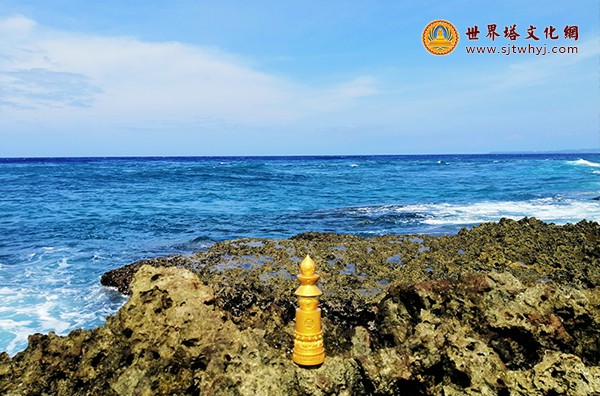 古朽珊瑚礁海岸的金色宝箧印陀罗尼宝塔