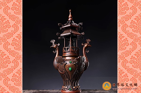 紫铜制双凤耳宝塔香炉。宣德炉精品造型珍藏鉴赏,绿宝石镶嵌,做工精细,造型独特。