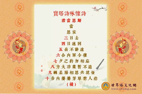 宝塔诗,杂体诗的一种,是一种摹状而吟、风格独特的诗体。顾名思义,它形如宝塔。从一字句或两字句的塔尖开始,向下延伸,逐层增加字数至七字句的塔底终止,如此排列下来,构成一个等腰三角形,即如塔形、山形。起始的字,既为诗题,又为诗韵。宝塔诗,原称“一字至七字诗”,也叫“一七体诗”。从一字到七字句,逐句成韵,或叠两句为一韵,很有规律。后来有的增加到十字,甚至十五字的。