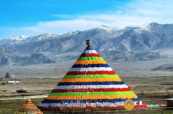 塔型经幡是藏区一种独特的经幡形式,以其层层系挂、片片重叠的金字塔造型而闻名,通常围绕中心玛尼堆或经幡柱搭建,规模宏大壮观。